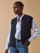 A garter stitch, sleeveless cardigan knit with an Italian yarn of remarkable quality. A garment with an edge-to-edge style to wear over a romantic blouse for feminine outfits or over a shirt with tie neckline for trendier allure. Made in Italy.