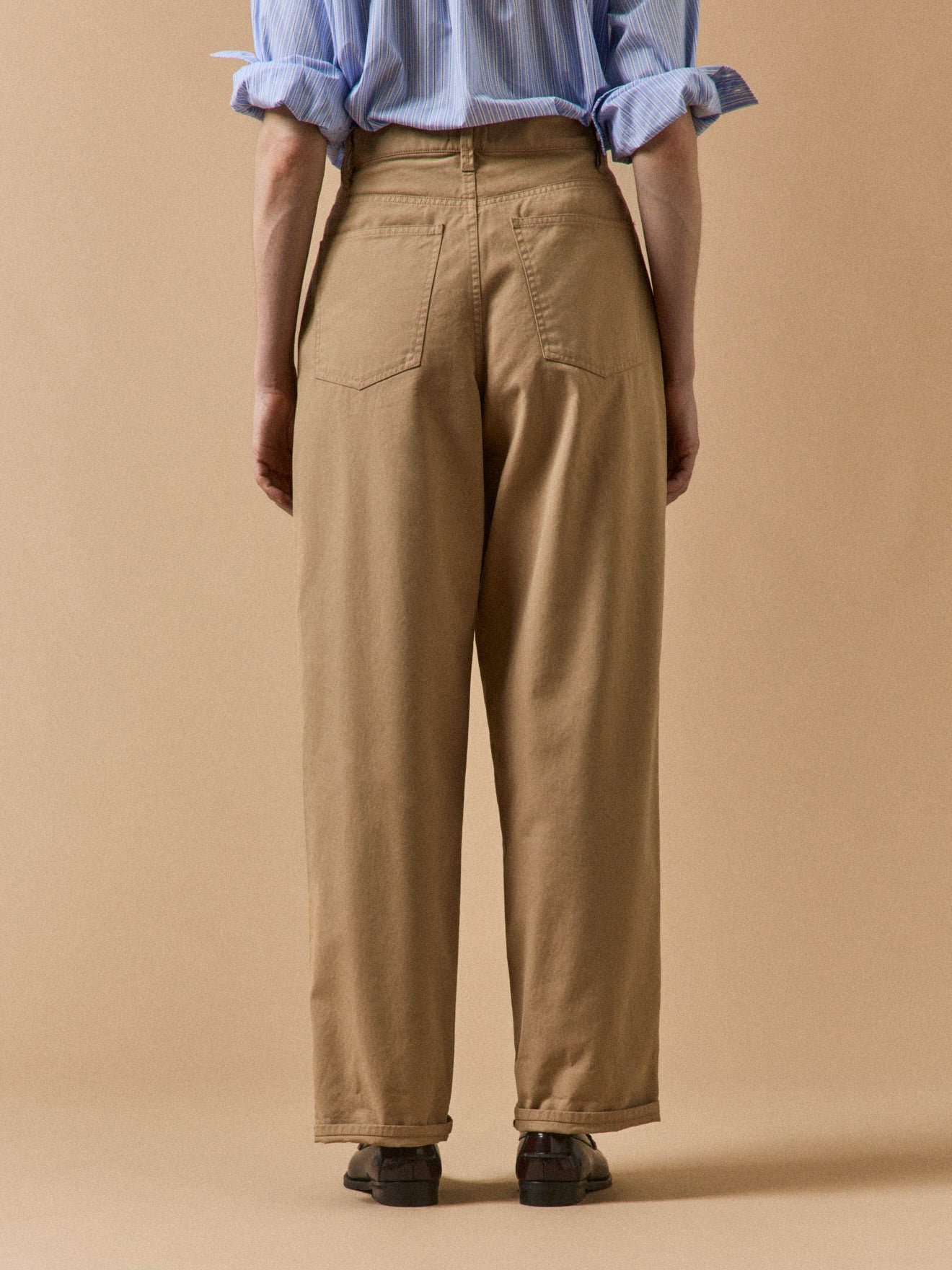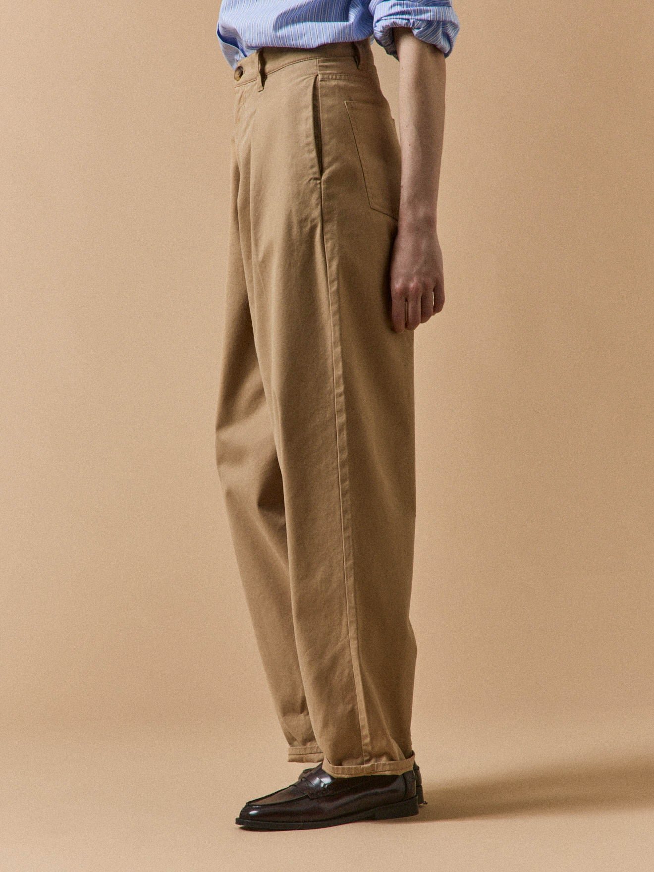 A wide carrot leg, darts, pleats, slant front pockets, and back patch pockets. A key piece for chic casual style, these trousers deliver just the right details in a pleasant-wear cotton twill.